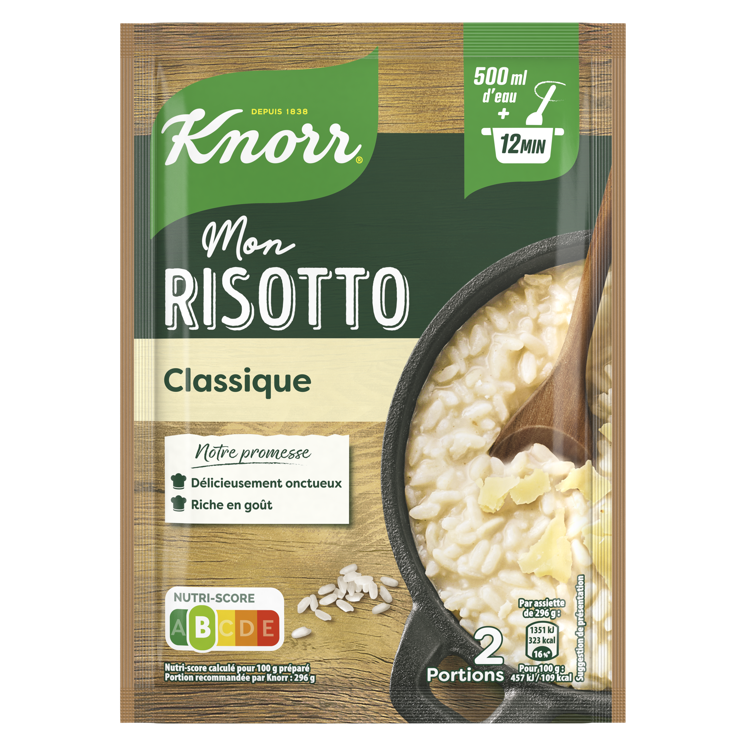 Laissez-vous séduire par nos recettes de risottos, à la fois onctueuses et savoureuses. Découvrez notre délicieux Risotto Knorr Le Classique préparé à partir de riz 100 % italien issu de l’agriculture durable. Nutri-score B, sans conservateur et sans exhausteur de goût, notre risotto est riche en goût et délicieusement crémeux. Comment préparer un bon risotto Knorr : versez le contenu du sachet dans 500 ml d’eau froide, puis portez à ébullition en remuant régulièrement avec un fouet. Ramenez à feu doux et laissez mijoter 12 minutes pour une cuisson al dente, ou 15 minutes pour un riz bien cuit, en remuant de temps à autre. Inutile de saler. Pour un risotto encore plus gourmand : ajoutez une noix de beurre et un peu de fromage râpé !